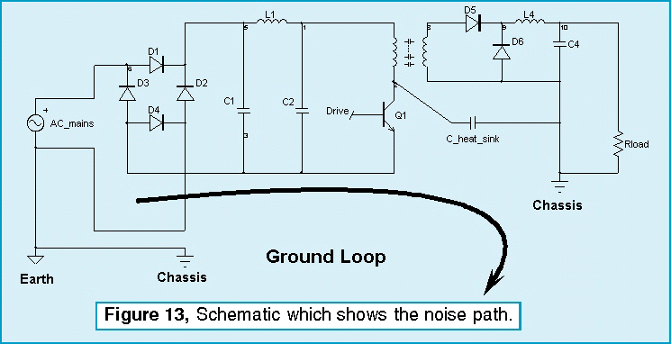 Ground loop noise is caused by the coupling of the AC mains return to the chassis or local PWB ground through stray capacitance. The switching transistor in a switched mode power supply generates the noise. The schematic in Figure 13 illustrates the noise path.